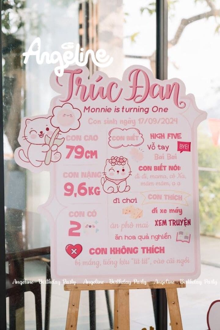Một trong những điểm thu hút tại buổi tiệc là bảng milestone. Trên đó, gia đình và khách mời có thể nhìn thấy hành trình phát triển của bé Trúc Đan qua từng tháng tuổi. Thông tin như cân nặng, chiều cao, sở thích nhỏ bé của con đều được ghi lại một cách tinh tế, giúp mọi người cảm nhận rõ ràng sự lớn lên từng ngày của bé.