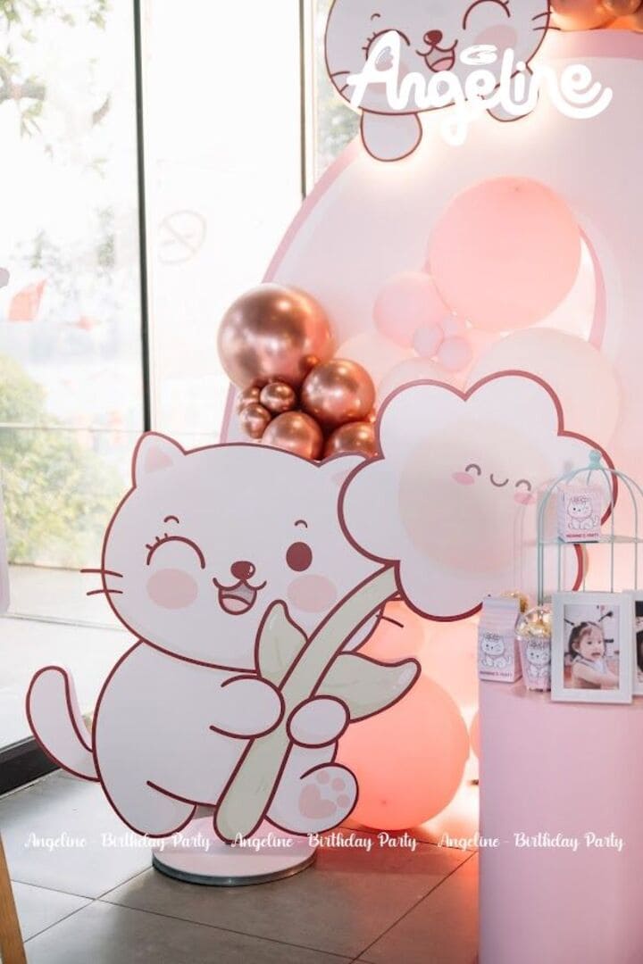Xung quanh backdrop, Angeline bố trí thêm chi tiết mây hồng, nhân vật hoạt hình dễ thương và góc check-in cho khách mời. Các bé tham dự có thể vui vẻ tạo dáng bên cạnh mô hình thú cưng nhỏ xinh, trong khi người lớn thì có những góc chụp ảnh sang trọng nhưng vẫn tràn đầy màu sắc tuổi thơ. Mỗi chi tiết đều được phối hợp một cách hài hòa, mang đến một không gian trọn vẹn cho buổi tiệc.