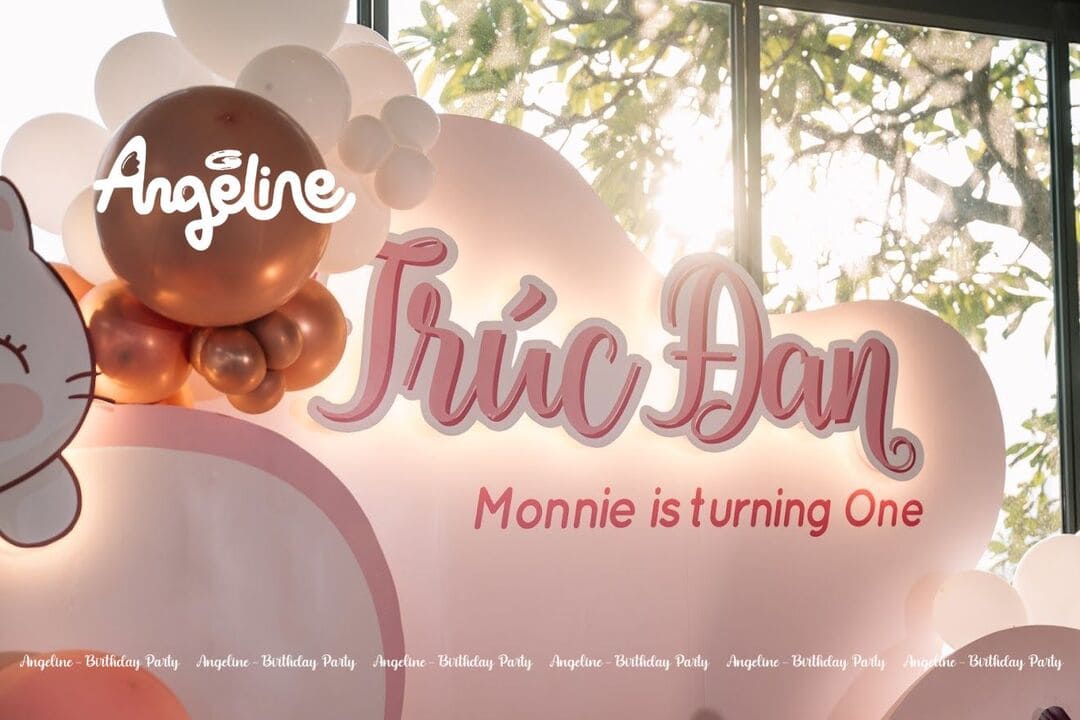 Backdrop của concept Pink Dream được thiết kế nổi bật với tên “Trúc Đan” đặt ở vị trí trung tâm, được bo tròn bằng những đường nét mềm mại. Tone hồng pastel nhẹ nhàng phối hợp cùng ánh đèn vàng ấm áp giúp tạo nên một không gian lung linh và sang trọng. Điểm nhấn đặc biệt là con số “1” phát sáng, tượng trưng cho tuổi đầu đời, vừa mang tính kỷ niệm vừa tạo sự ấn tượng cho toàn bộ không gian.