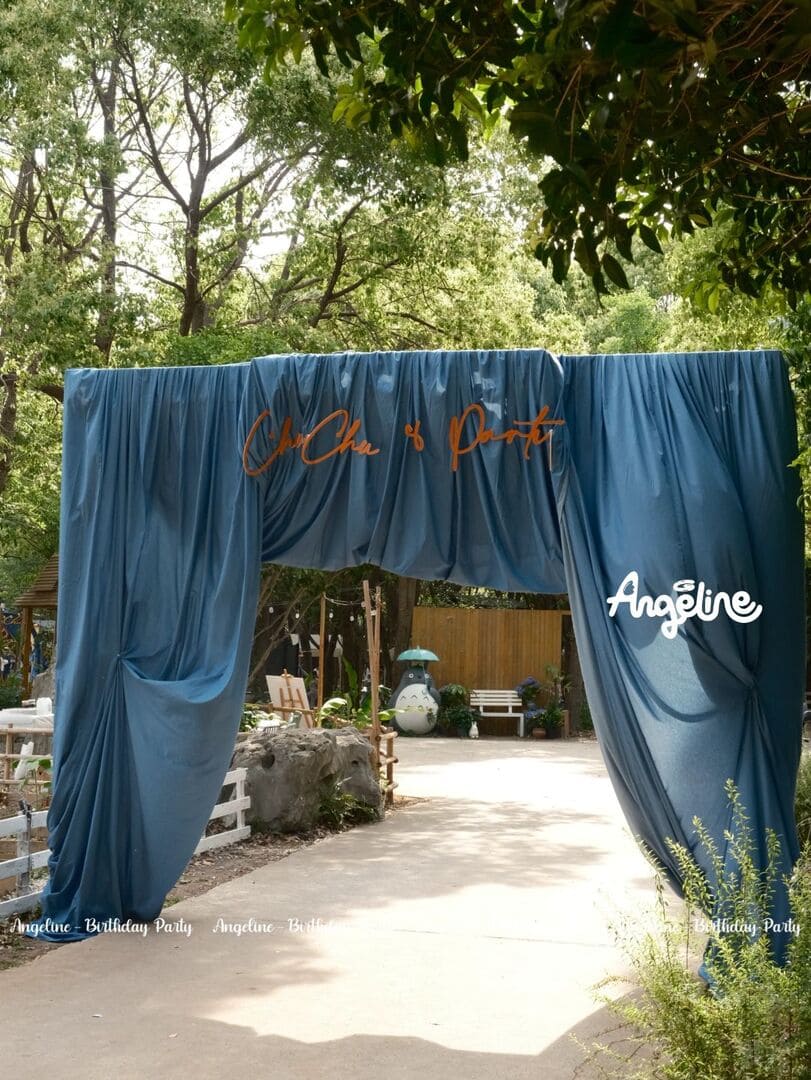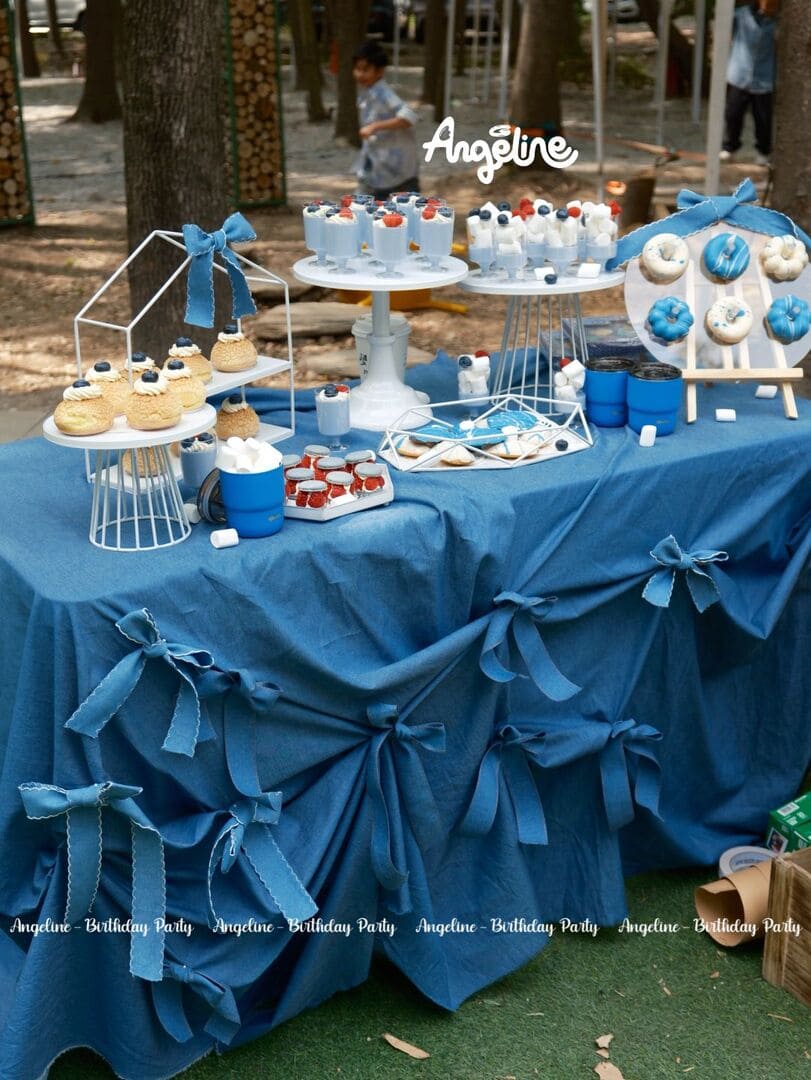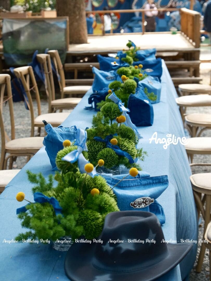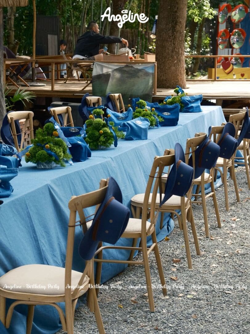 Cổng chào “ChuChu’s” được dựng bằng vải xanh dày, kết hợp cùng font chữ cowboy đặc trưng, khiến ai bước qua cũng như đang bước vào vùng đất của tự do và khám phá. Backdrop sân khấu với dòng chữ “Happy Birthday ChuChu” nổi bật trên nền xanh denim, được tạo khối tầng lớp để tăng chiều sâu và cảm giác phiêu lưu. Ngay cả khu bàn ăn dài cũng là một điểm nhấn – phủ khăn denim, điểm xuyết bằng những đóa hoa vàng xen lẫn lá xanh, vừa tươi mát vừa thanh lịch.