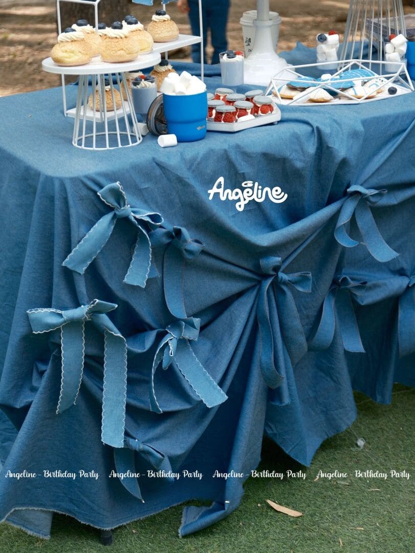 Chất liệu decor được lựa chọn kỹ lưỡng: gỗ, vải thô, dây nơ denim – vừa mộc mạc, vừa ấm áp. Mỗi góc bàn, mỗi chi tiết đều như lời nhắn nhủ về sự tinh tế và tình yêu mà đội ngũ Angeline đặt vào đó. Khi ánh sáng vàng phản chiếu lên mặt bàn denim, từng món bánh trở nên lung linh như những ngôi sao nhỏ, góp phần làm cho buổi tiệc thêm phần rực rỡ và ý nghĩa.