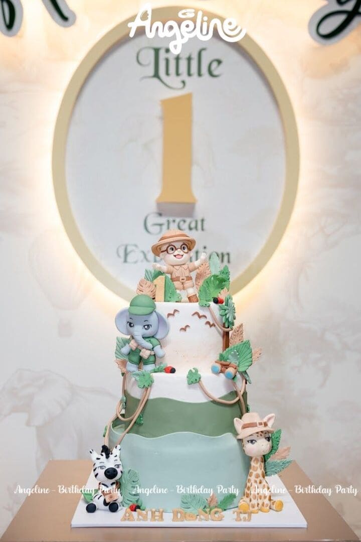 Chiếc bánh sinh nhật ba tầng của bé Anh Dũng là một tuyệt tác nghệ thuật được tạo nên bởi bàn tay tài hoa của đội ngũ Angeline. Lấy cảm hứng từ thế giới hoang dã, chiếc bánh được thiết kế theo phong cách safari, với tông màu kem, nâu và xanh lá làm chủ đạo. Trên từng tầng bánh là hình ảnh những nhân vật đáng yêu: voi con, hươu cao cổ, ngựa vằn, sư tử nhỏ – tất cả được nặn thủ công tỉ mỉ, sinh động đến từng chi tiết.