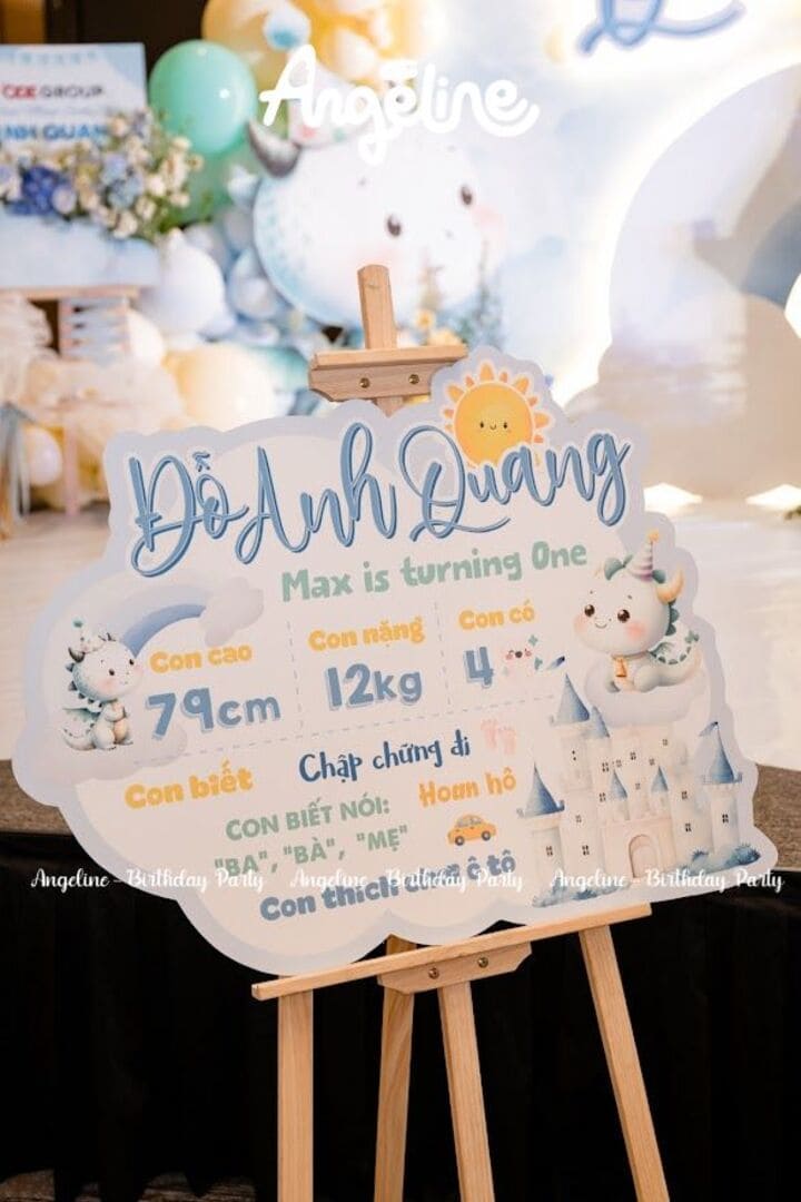 Bảng milestone được thiết kế riêng để ghi lại những cột mốc phát triển của Max. Từng con số, từng chi tiết như cân nặng, chiều cao, sở thích đều gợi lại bao kỷ niệm. Đây là điểm nhấn giúp mọi người nhìn lại cả chặng đường đầy yêu thương của bé trong năm đầu tiên.