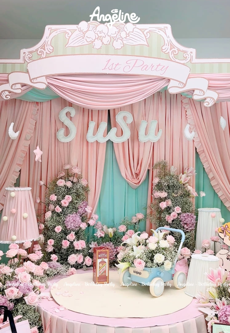 Backdrop với dòng chữ “Happy Birthday SuSu” nổi bật trên nền pastel trở thành góc chụp ảnh lý tưởng cho cả gia đình và khách mời. Những bó hoa tươi được cắm tỉ mỉ, ánh đèn vàng lung linh, tạo nên khung cảnh rực rỡ. Tất cả mọi người cùng nâng ly chúc mừng, cùng hát vang bài hát chúc mừng sinh nhật, tạo nên không khí vừa ấm cúng vừa sôi động. Với bé SuSu, đây chắc chắn là một ngày hội lớn, nơi em nhận được tình yêu thương trọn vẹn từ gia đình và bạn bè.